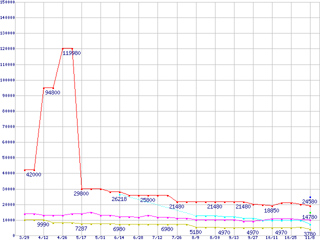 PC3-12800(DDR3-1600) DDR3 SDRAM DIMMの最安値推移