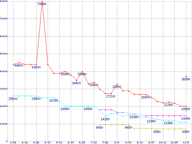 PC3-12800(DDR3-1600) DDR3 SDRAM DIMMの最安値推移