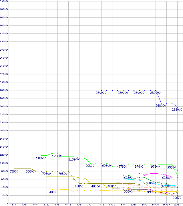 | HDD/SSD主要製品(最安値2万円以上)の最安値推移 | | | (2008年4月3日~2008年11月13日) |