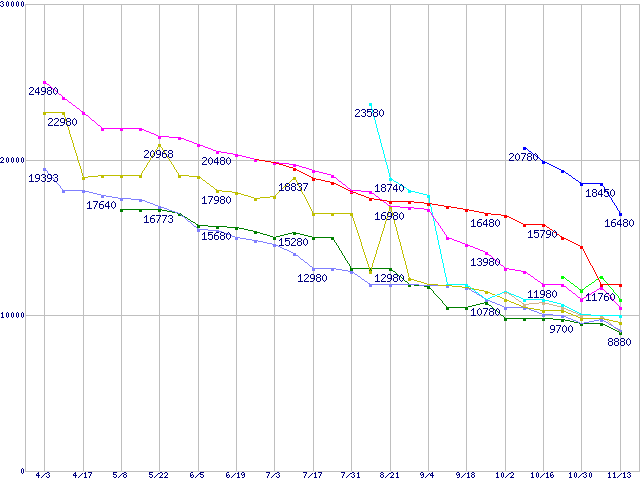 HDD/SSD主要製品(最安値1万円未満)の最安値推移