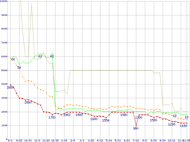 ※このグラフは過去のデータも税率5%相当に調整した税込み相当額のグラフです。 税率変更や、総額表示方式導入(2004年4月)の影響は除いています。 | | | ●凡例 | 最安値 (点線部は販売店未確認 または未調査) | 平均値 | 最高値 | ショップ数 |
