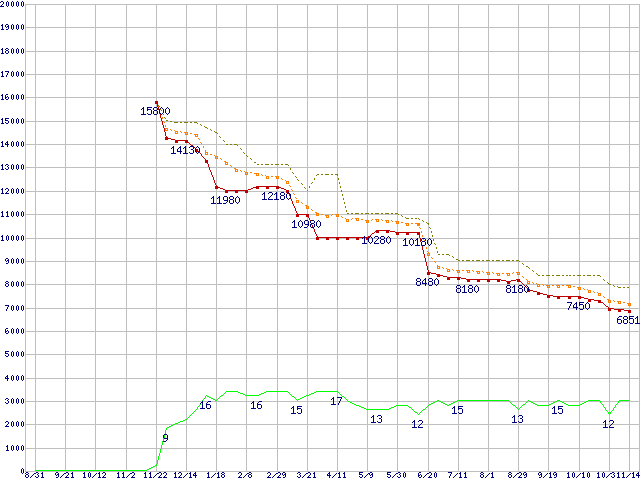 | Athlon X2 5200 (2.7GHz,L2 512KB×2)の価格推移 | | | (2007年8月31日~2008年11月14日) |