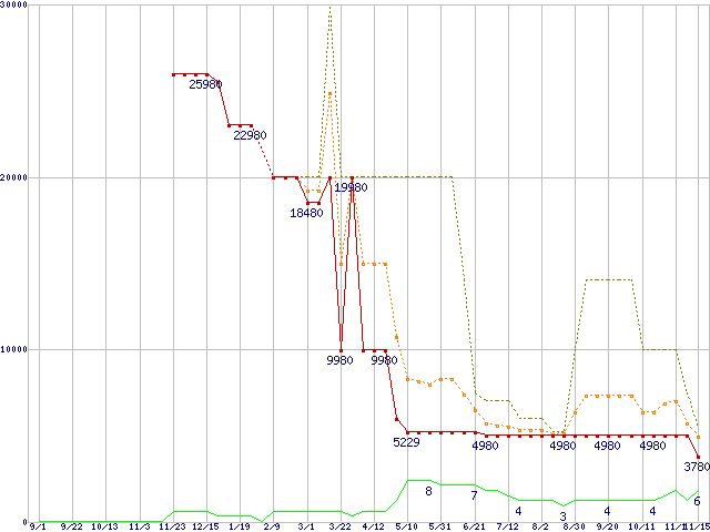 ※このグラフは過去のデータも税率5%相当に調整した税込み相当額のグラフです。 税率変更や、総額表示方式導入(2004年4月)の影響は除いています。 | | | ●凡例 | 最安値 (点線部は販売店未確認 または未調査) | 平均値 | 最高値 | ショップ数 |