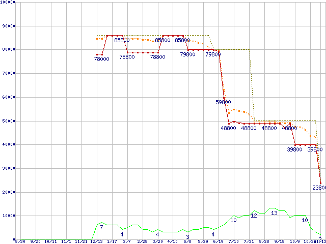 ※このグラフは過去のデータも税率5%相当に調整した税込み相当額のグラフです。 税率変更や、総額表示方式導入(2004年4月)の影響は除いています。 | | | ●凡例 | 最安値 (点線部は販売店未確認 または未調査) | 平均値 | 最高値 | ショップ数 |