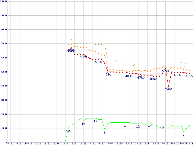 ※このグラフは過去のデータも税率5%相当に調整した税込み相当額のグラフです。 税率変更や、総額表示方式導入(2004年4月)の影響は除いています。 | | | ●凡例 | 最安値 (点線部は販売店未確認 または未調査) | 平均値 | 最高値 | ショップ数 |