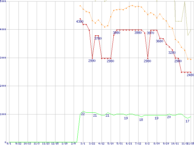 ※このグラフは過去のデータも税率5%相当に調整した税込み相当額のグラフです。 税率変更や、総額表示方式導入(2004年4月)の影響は除いています。 | | | ●凡例 | 最安値 (点線部は販売店未確認 または未調査) | 平均値 | 最高値 | ショップ数 |