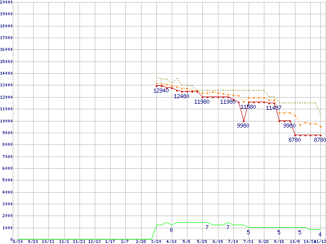 ※このグラフは過去のデータも税率5%相当に調整した税込み相当額のグラフです。 税率変更や、総額表示方式導入(2004年4月)の影響は除いています。 | | | ●凡例 | 最安値 (点線部は販売店未確認 または未調査) | 平均値 | 最高値 | ショップ数 |