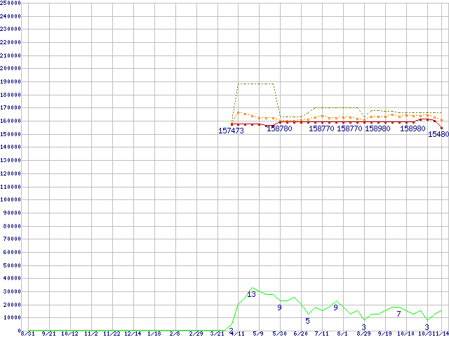 ※このグラフは過去のデータも税率5%相当に調整した税込み相当額のグラフです。 税率変更や、総額表示方式導入(2004年4月)の影響は除いています。 | | | ●凡例 | 最安値 (点線部は販売店未確認 または未調査) | 平均値 | 最高値 | ショップ数 |
