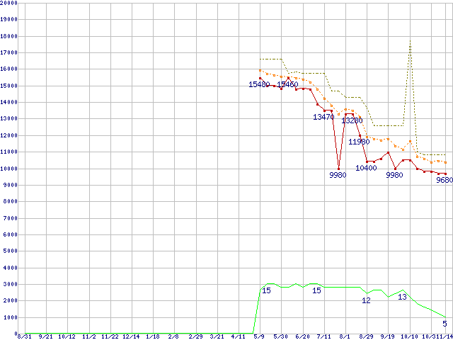 ※このグラフは過去のデータも税率5%相当に調整した税込み相当額のグラフです。 税率変更や、総額表示方式導入(2004年4月)の影響は除いています。 | | | ●凡例 | 最安値 (点線部は販売店未確認 または未調査) | 平均値 | 最高値 | ショップ数 |
