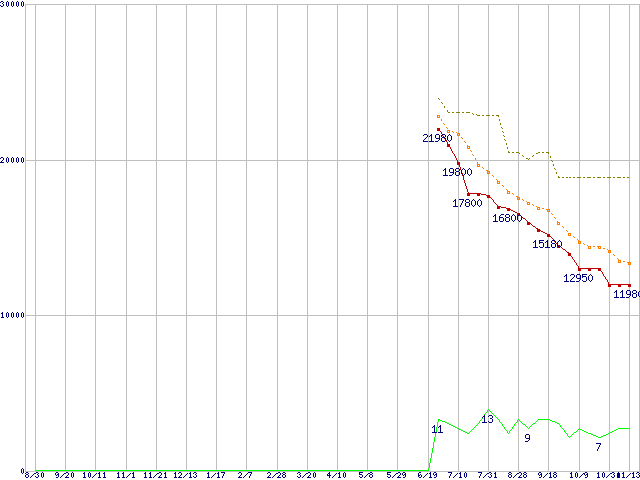 ※このグラフは過去のデータも税率5%相当に調整した税込み相当額のグラフです。 税率変更や、総額表示方式導入(2004年4月)の影響は除いています。 | | | ●凡例 | 最安値 (点線部は販売店未確認 または未調査) | 平均値 | 最高値 | ショップ数 |