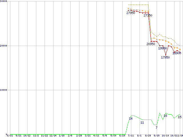 ※このグラフは過去のデータも税率5%相当に調整した税込み相当額のグラフです。 税率変更や、総額表示方式導入(2004年4月)の影響は除いています。 | | | ●凡例 | 最安値 (点線部は販売店未確認 または未調査) | 平均値 | 最高値 | ショップ数 |