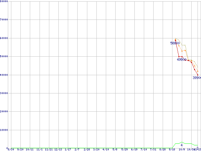 ※このグラフは過去のデータも税率5%相当に調整した税込み相当額のグラフです。 税率変更や、総額表示方式導入(2004年4月)の影響は除いています。 | | | ●凡例 | 最安値 (点線部は販売店未確認 または未調査) | 平均値 | 最高値 | ショップ数 |