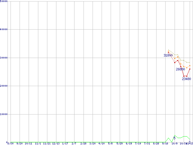 ※このグラフは過去のデータも税率5%相当に調整した税込み相当額のグラフです。 税率変更や、総額表示方式導入(2004年4月)の影響は除いています。 | | | ●凡例 | 最安値 (点線部は販売店未確認 または未調査) | 平均値 | 最高値 | ショップ数 |