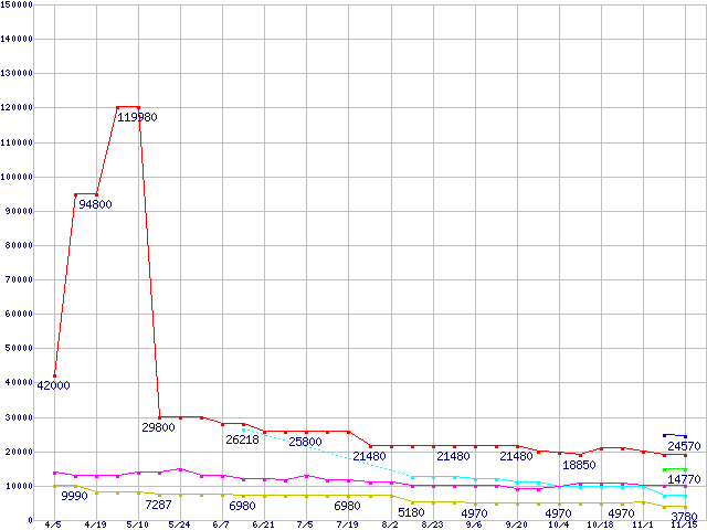 PC3-12800(DDR3-1600) DDR3 SDRAM DIMMの最安値推移