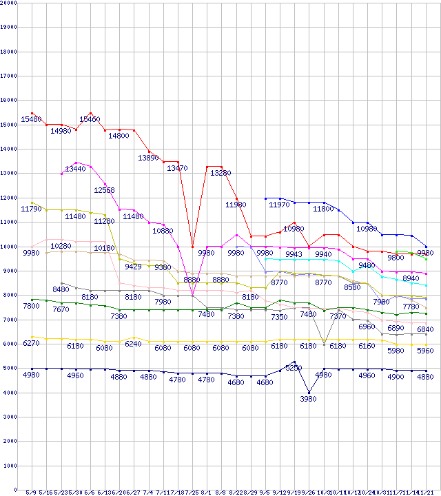| CPU主要製品(最安値1万円未満)の最安値推移 | | | (2008年5月9日~2008年11月21日) |