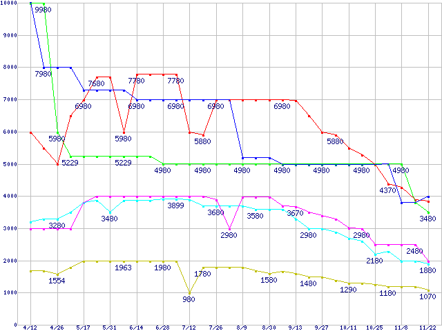 メモリ主要製品(最安値5千円~1万円未満)の最安値推移