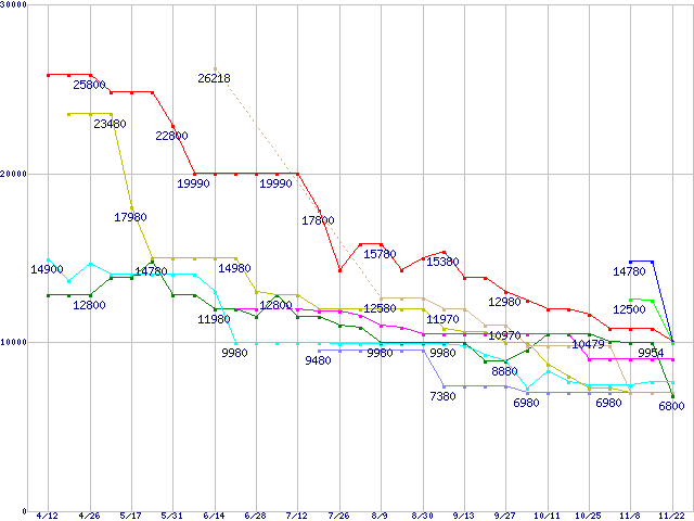 メモリ主要製品(最安値1万円以上)の最安値推移