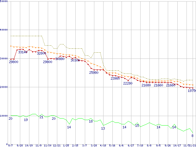 ※このグラフは過去のデータも税率5%相当に調整した税込み相当額のグラフです。 税率変更や、総額表示方式導入(2004年4月)の影響は除いています。 | | | ●凡例 | 最安値 (点線部は販売店未確認 または未調査) | 平均値 | 最高値 | ショップ数 |