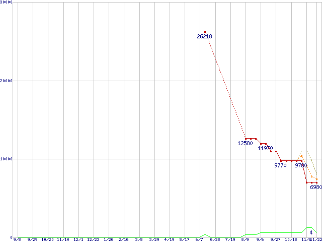 ※このグラフは過去のデータも税率5%相当に調整した税込み相当額のグラフです。 税率変更や、総額表示方式導入(2004年4月)の影響は除いています。 | | | ●凡例 | 最安値 (点線部は販売店未確認 または未調査) | 平均値 | 最高値 | ショップ数 |