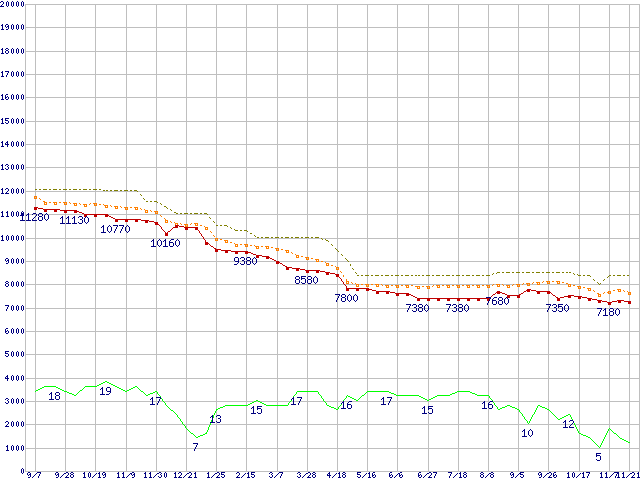 | Pentium Dual-Core E2180 (2.0GHz,L2 1MB)の価格推移 | | | (2007年9月7日~2008年11月21日) |