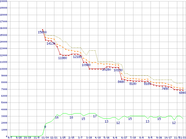 | Athlon X2 5200 (2.7GHz,L2 512KB×2)の価格推移 | | | (2007年9月7日~2008年11月21日) |