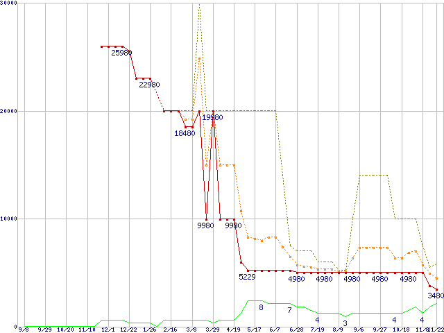※このグラフは過去のデータも税率5%相当に調整した税込み相当額のグラフです。 税率変更や、総額表示方式導入(2004年4月)の影響は除いています。 | | | ●凡例 | 最安値 (点線部は販売店未確認 または未調査) | 平均値 | 最高値 | ショップ数 |