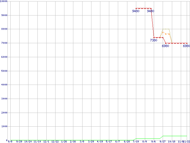 ※このグラフは過去のデータも税率5%相当に調整した税込み相当額のグラフです。 税率変更や、総額表示方式導入(2004年4月)の影響は除いています。 | | | ●凡例 | 最安値 (点線部は販売店未確認 または未調査) | 平均値 | 最高値 | ショップ数 |