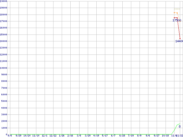 ※このグラフは過去のデータも税率5%相当に調整した税込み相当額のグラフです。 税率変更や、総額表示方式導入(2004年4月)の影響は除いています。 | | | ●凡例 | 最安値 (点線部は販売店未確認 または未調査) | 平均値 | 最高値 | ショップ数 |