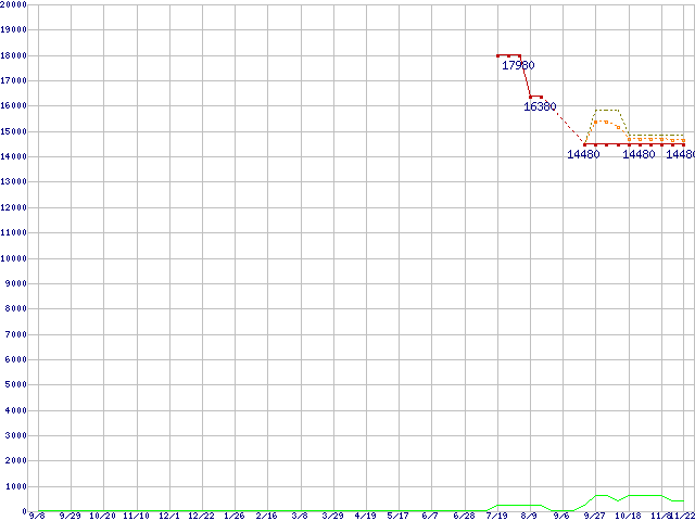 ※このグラフは過去のデータも税率5%相当に調整した税込み相当額のグラフです。 税率変更や、総額表示方式導入(2004年4月)の影響は除いています。 | | | ●凡例 | 最安値 (点線部は販売店未確認 または未調査) | 平均値 | 最高値 | ショップ数 |