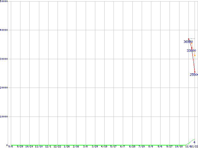 ※このグラフは過去のデータも税率5%相当に調整した税込み相当額のグラフです。 税率変更や、総額表示方式導入(2004年4月)の影響は除いています。 | | | ●凡例 | 最安値 (点線部は販売店未確認 または未調査) | 平均値 | 最高値 | ショップ数 |