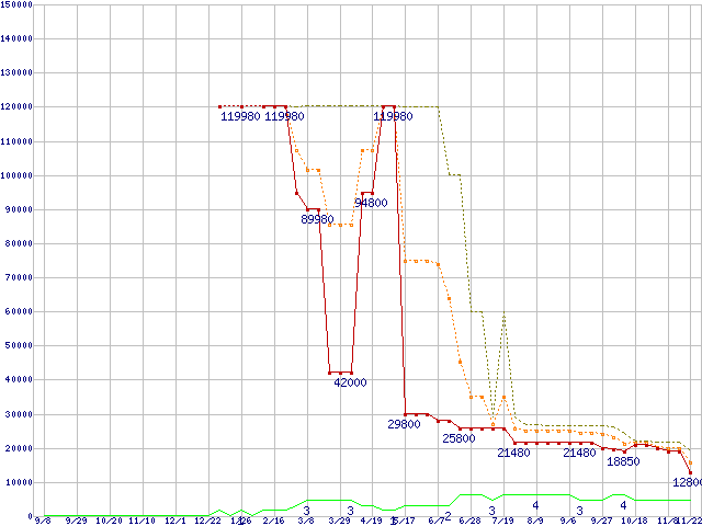 ※このグラフは過去のデータも税率5%相当に調整した税込み相当額のグラフです。 税率変更や、総額表示方式導入(2004年4月)の影響は除いています。 | | | ●凡例 | 最安値 (点線部は販売店未確認 または未調査) | 平均値 | 最高値 | ショップ数 |
