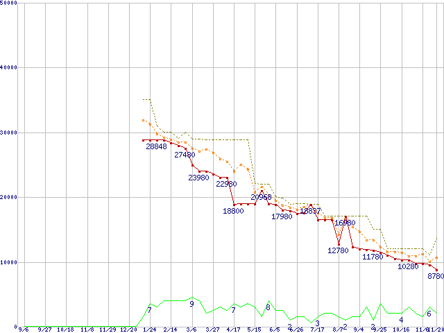| HD103UJ (1TB,32MB)の価格推移 | | | (2007年9月6日~2008年11月20日) |