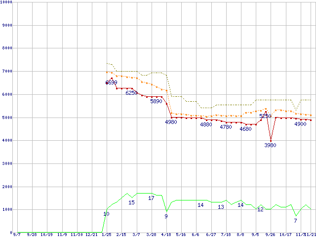 ※このグラフは過去のデータも税率5%相当に調整した税込み相当額のグラフです。 税率変更や、総額表示方式導入(2004年4月)の影響は除いています。 | | | ●凡例 | 最安値 (点線部は販売店未確認 または未調査) | 平均値 | 最高値 | ショップ数 |