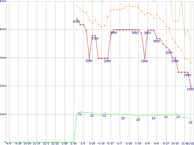 ※このグラフは過去のデータも税率5%相当に調整した税込み相当額のグラフです。 税率変更や、総額表示方式導入(2004年4月)の影響は除いています。 | | | ●凡例 | 最安値 (点線部は販売店未確認 または未調査) | 平均値 | 最高値 | ショップ数 |