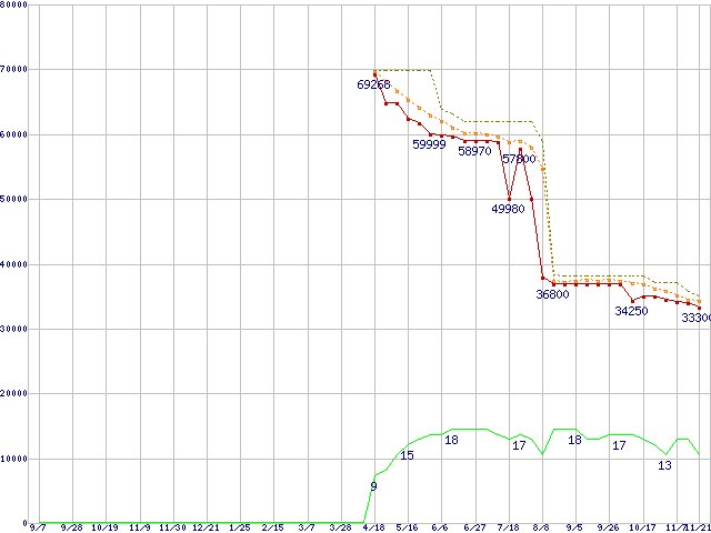 ※このグラフは過去のデータも税率5%相当に調整した税込み相当額のグラフです。 税率変更や、総額表示方式導入(2004年4月)の影響は除いています。 | | | ●凡例 | 最安値 (点線部は販売店未確認 または未調査) | 平均値 | 最高値 | ショップ数 |