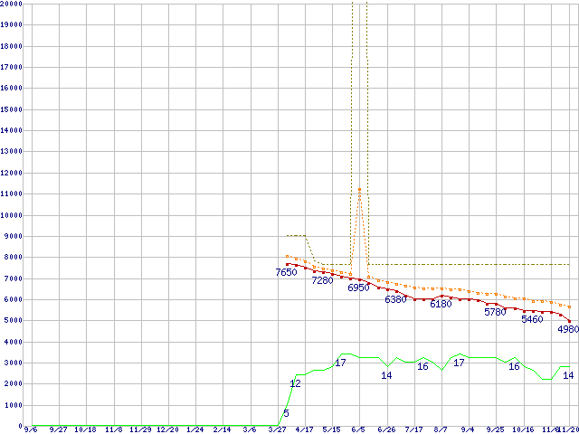 ※このグラフは過去のデータも税率5%相当に調整した税込み相当額のグラフです。 税率変更や、総額表示方式導入(2004年4月)の影響は除いています。 | | | ●凡例 | 最安値 (点線部は販売店未確認 または未調査) | 平均値 | 最高値 | ショップ数 |