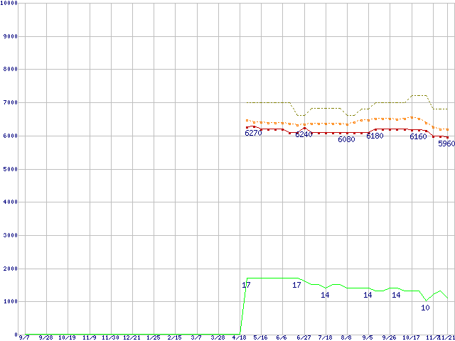 ※このグラフは過去のデータも税率5%相当に調整した税込み相当額のグラフです。 税率変更や、総額表示方式導入(2004年4月)の影響は除いています。 | | | ●凡例 | 最安値 (点線部は販売店未確認 または未調査) | 平均値 | 最高値 | ショップ数 |