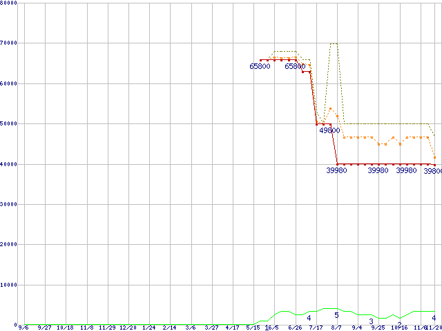 ※このグラフは過去のデータも税率5%相当に調整した税込み相当額のグラフです。 税率変更や、総額表示方式導入(2004年4月)の影響は除いています。 | | | ●凡例 | 最安値 (点線部は販売店未確認 または未調査) | 平均値 | 最高値 | ショップ数 |