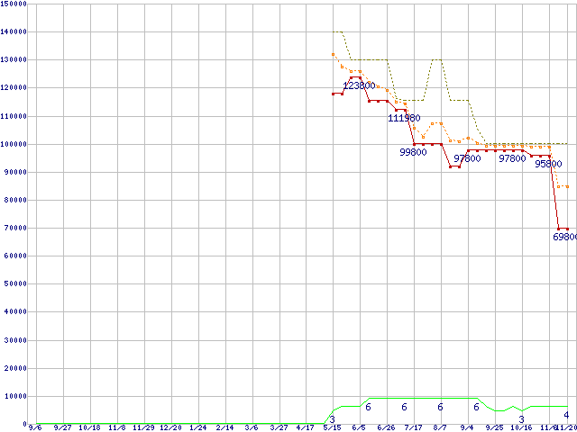 ※このグラフは過去のデータも税率5%相当に調整した税込み相当額のグラフです。 税率変更や、総額表示方式導入(2004年4月)の影響は除いています。 | | | ●凡例 | 最安値 (点線部は販売店未確認 または未調査) | 平均値 | 最高値 | ショップ数 |