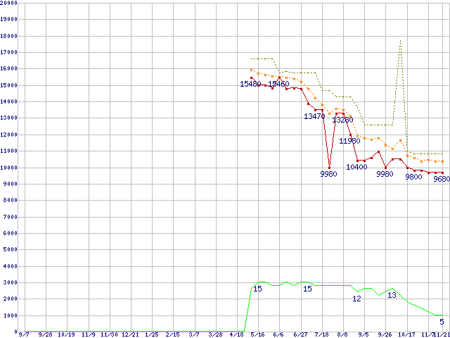 ※このグラフは過去のデータも税率5%相当に調整した税込み相当額のグラフです。 税率変更や、総額表示方式導入(2004年4月)の影響は除いています。 | | | ●凡例 | 最安値 (点線部は販売店未確認 または未調査) | 平均値 | 最高値 | ショップ数 |