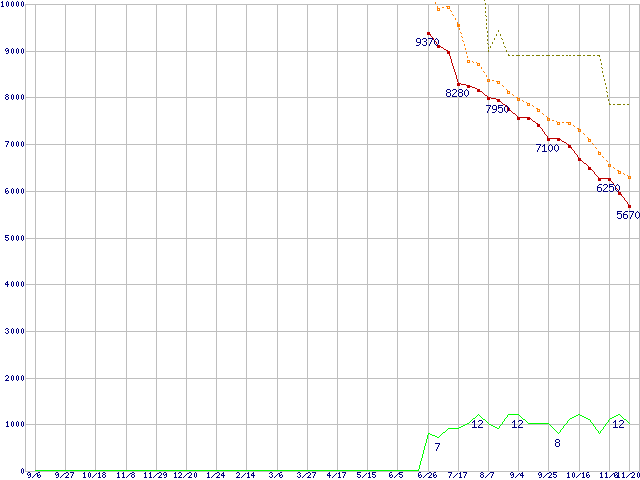 ※このグラフは過去のデータも税率5%相当に調整した税込み相当額のグラフです。 税率変更や、総額表示方式導入(2004年4月)の影響は除いています。 | | | ●凡例 | 最安値 (点線部は販売店未確認 または未調査) | 平均値 | 最高値 | ショップ数 |