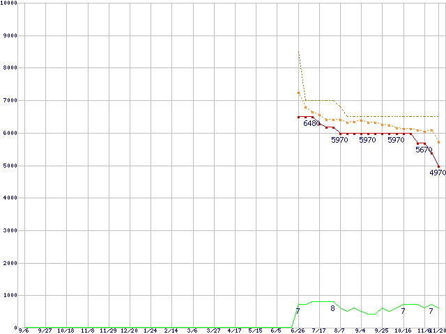 ※このグラフは過去のデータも税率5%相当に調整した税込み相当額のグラフです。 税率変更や、総額表示方式導入(2004年4月)の影響は除いています。 | | | ●凡例 | 最安値 (点線部は販売店未確認 または未調査) | 平均値 | 最高値 | ショップ数 |