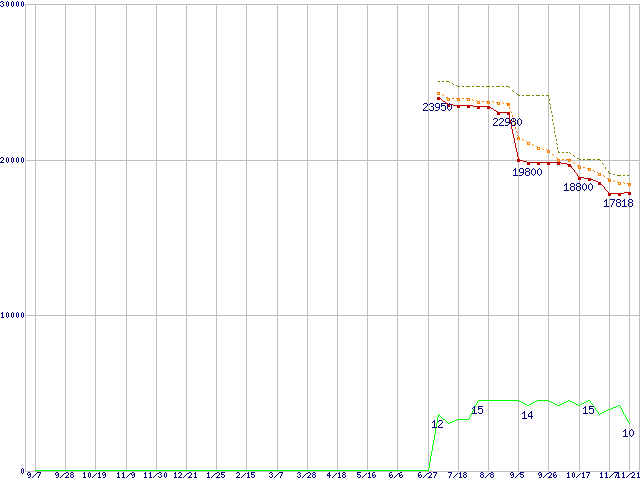 ※このグラフは過去のデータも税率5%相当に調整した税込み相当額のグラフです。 税率変更や、総額表示方式導入(2004年4月)の影響は除いています。 | | | ●凡例 | 最安値 (点線部は販売店未確認 または未調査) | 平均値 | 最高値 | ショップ数 |