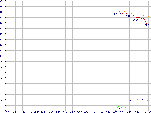 ※このグラフは過去のデータも税率5%相当に調整した税込み相当額のグラフです。 税率変更や、総額表示方式導入(2004年4月)の影響は除いています。 | | | ●凡例 | 最安値 (点線部は販売店未確認 または未調査) | 平均値 | 最高値 | ショップ数 |