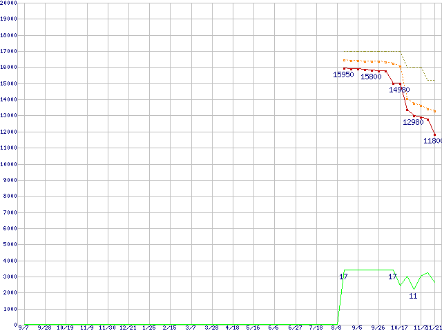 | Core 2 Duo E7300 (2.66GHz,L2 3MB)の価格推移 | | | (2007年9月7日~2008年11月21日) |