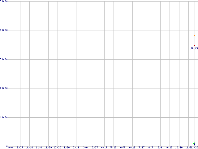 ※このグラフは過去のデータも税率5%相当に調整した税込み相当額のグラフです。 税率変更や、総額表示方式導入(2004年4月)の影響は除いています。 | | | ●凡例 | 最安値 (点線部は販売店未確認 または未調査) | 平均値 | 最高値 | ショップ数 |