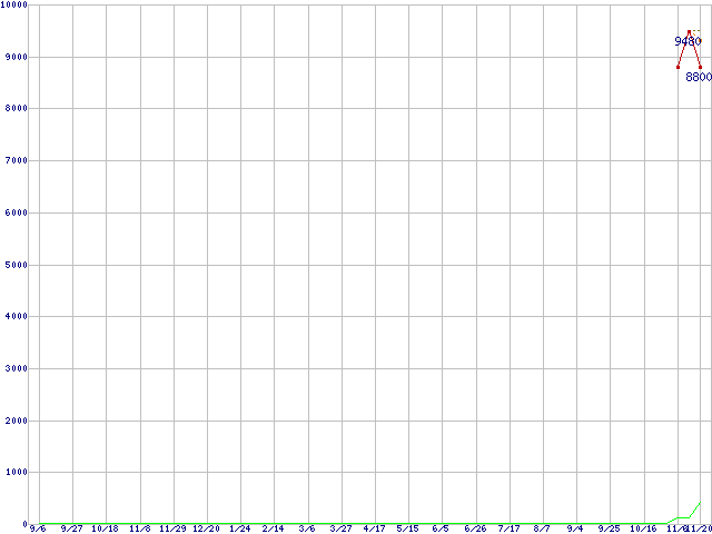 ※このグラフは過去のデータも税率5%相当に調整した税込み相当額のグラフです。 税率変更や、総額表示方式導入(2004年4月)の影響は除いています。 | | | ●凡例 | 最安値 (点線部は販売店未確認 または未調査) | 平均値 | 最高値 | ショップ数 |