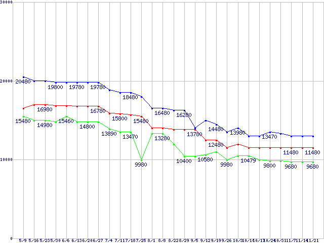 | Socket AM2 (HyperTransport 3.0,Triple Core,TDP 95W)の最安値推移 | | | (2008年5月9日~2008年11月21日) |