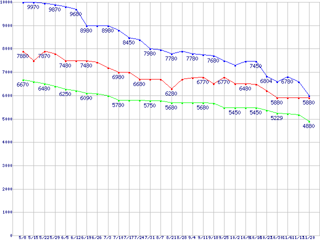 WD Caviar Blue (7200rpm,3Gb/s,16MB)の最安値推移