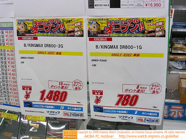 DDR2メモリの最安値更新、1GB=780円、2GB=1,480円に